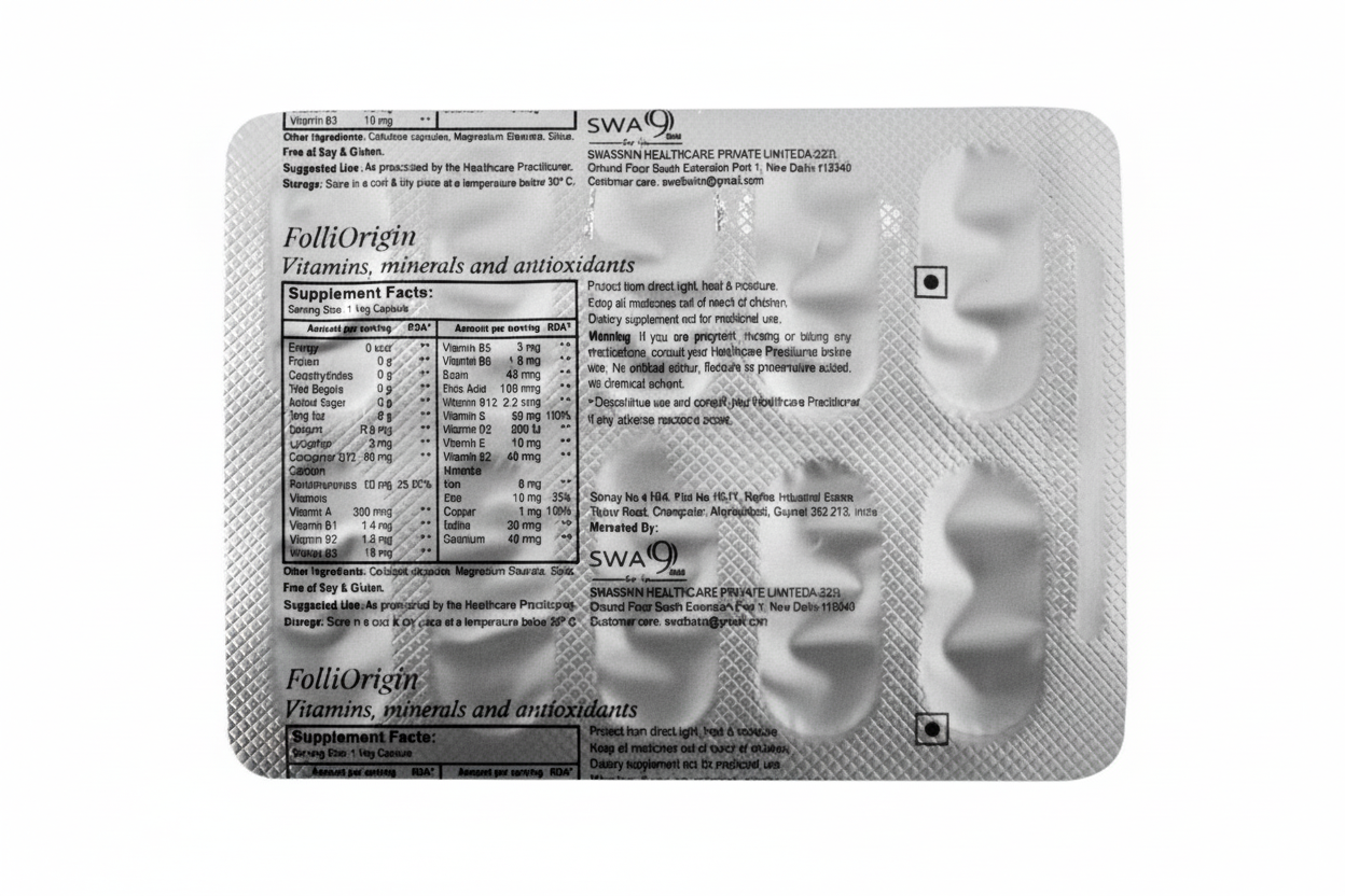 FolliOrigin is a complete hair growth supplement in Delhi NCR designed to reduce hair fall, strengthen roots, and prevent premature greying. With a potent combination of vitamins, minerals, amino acids, and antioxidants, it supports overall hair and health nutrition.